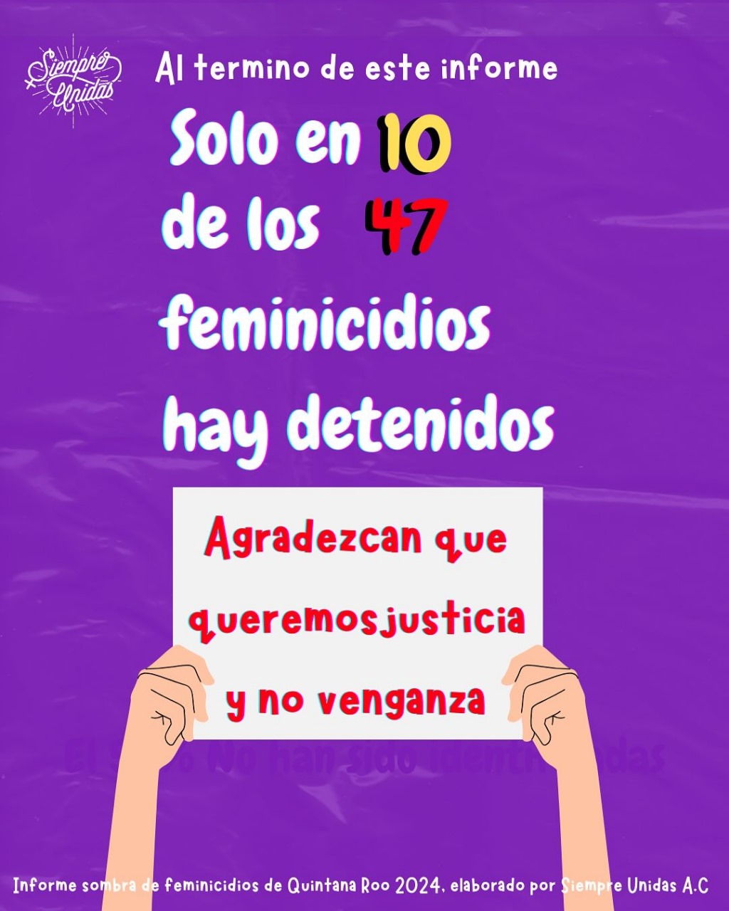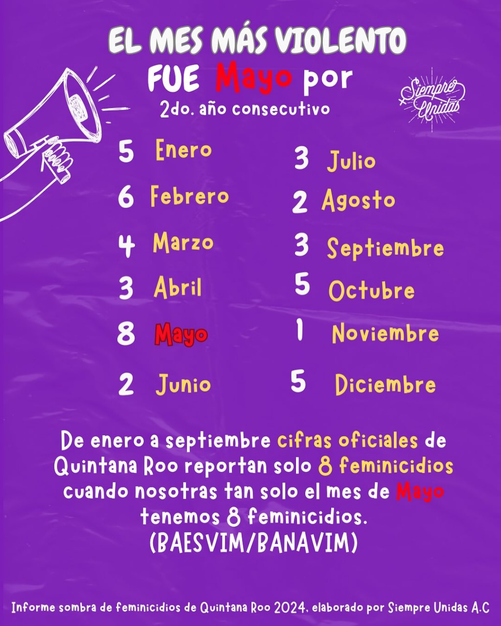 Para más información o para acceder al listado completo de feminicidios en Quintana Roo, se puede contactar a la organización “Siempre Unidas” en contacto@siempreunidas.org.