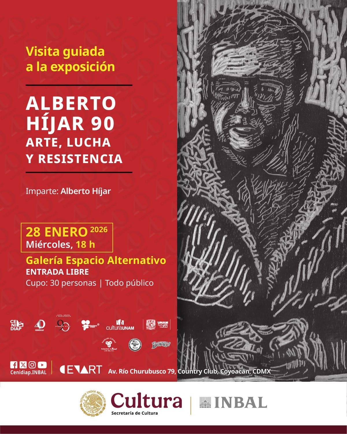 En el contexto de la exposición Alberto Híjar 90. Arte, lucha y resistencia, el Centro Nacional de Investigación, Documentación e Información de Artes Plásticas (CENIDIAP), adscrito a la Subdirección General de Educación e Investigación Artísticas (SGEIA) del Instituto Nacional de Bellas Artes y Literatura (INBAL), ofrecerá una serie de visitas guiadas en las que el público podrá dialogar con el filósofo y crítico de arte. Las actividades iniciarán el 28 de enero, a las 18 horas, en la Galería Espacio Alternativo del Centro Nacional de las Artes.