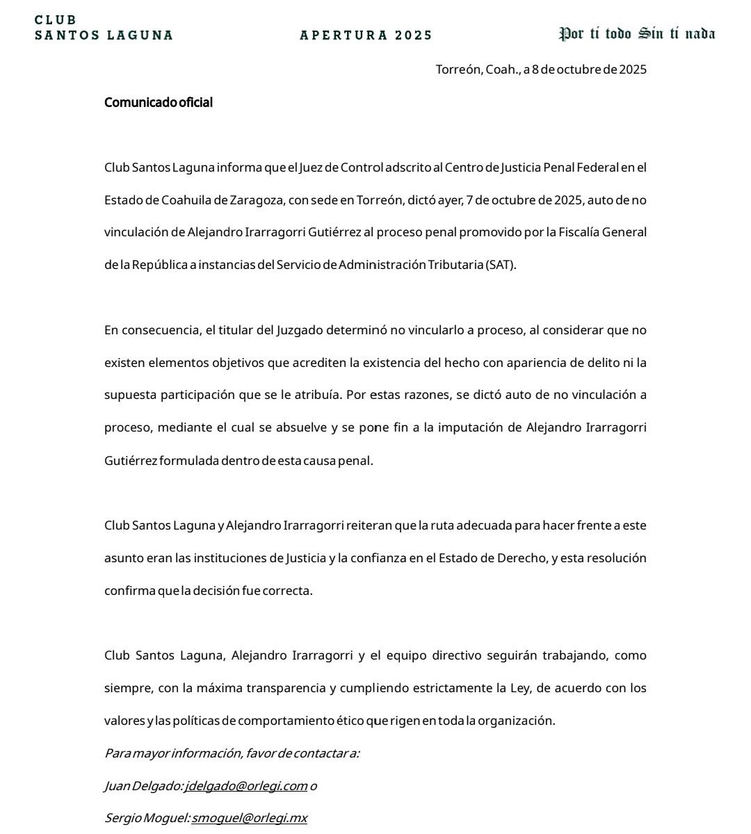 “El club Santos Laguna informa que el Juez de Control adscrito al Centro de Justicia Penal Federal en el Estado de Coahuila de Zaragoza con sede en Torreón, dictó ayer (martes), auto de no vinculación de Alejandro Irarragorri Gutiérrez al proceso penal promovido por la Fiscalía General de la República (FGR) a instancias del Servicio de Administración Tributaria (SAT)”, señaló el plantel en un comunicado.