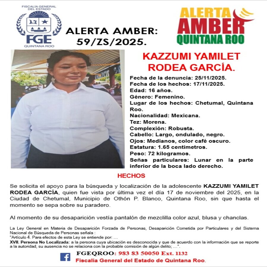 Chetumal, 27 de noviembre.- La Fiscalía General del Estado (FGE) activó la Alerta Amber 59/ZS/2025 para la búsqueda y localización de Kazzumi Yamilet Rodea García, adolescente de 16 años, reportada como no localizada en la capital del estado. La denuncia fue presentada el 25 de noviembre de 2025 por familiares directos, quienes indicaron no tener información sobre su paradero desde la fecha en que ocurrieron los hechos.