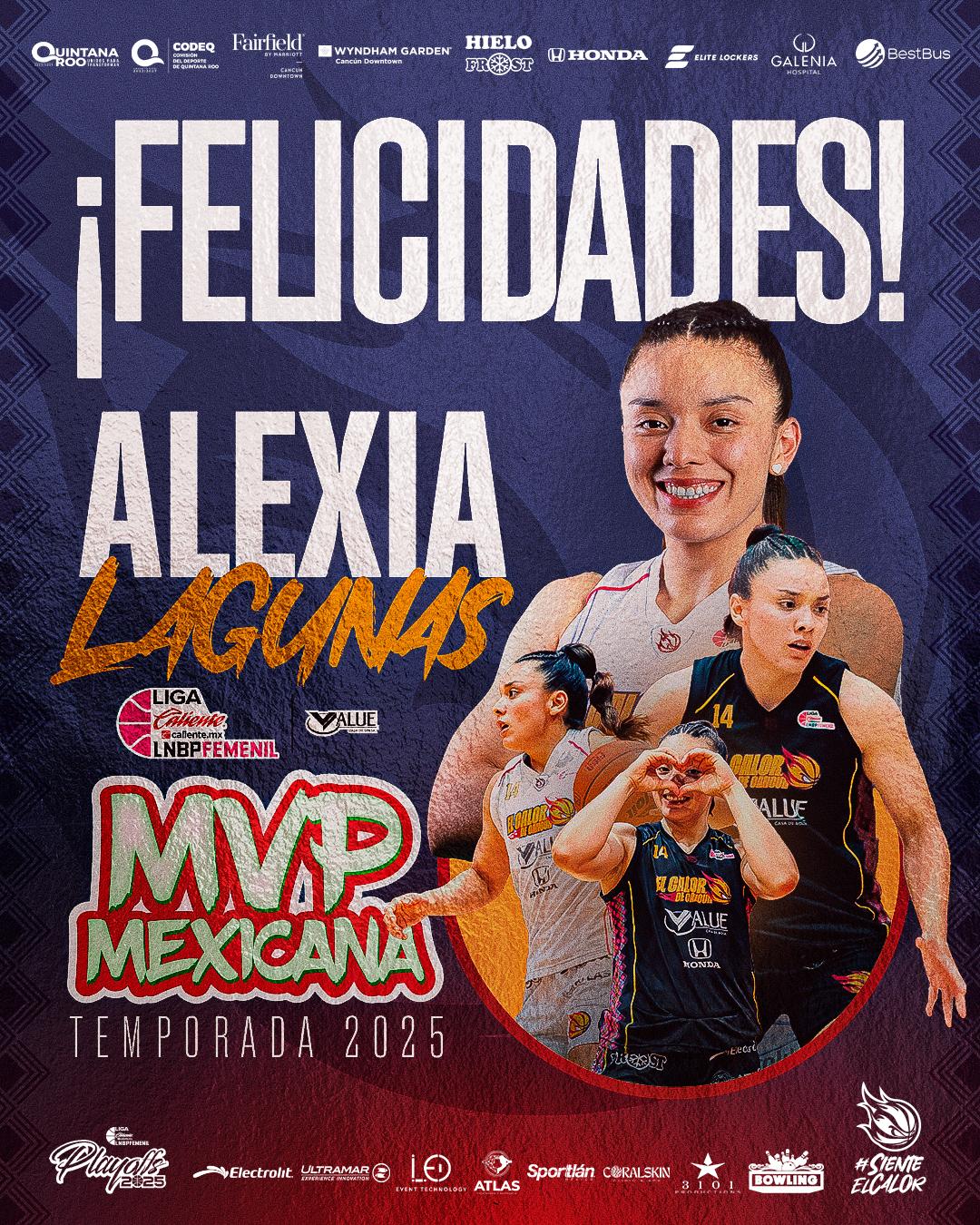 CANCÚN, Q. ROO a 12 de junio.- Tras su calificación a la antesala de la Serie Final de la Temporada 2025 de la Ia Liga Nacional de Baloncesto Profesional Femenil (LNBPF) Caliente.Mx, El Calor de Cancún no solo celebró este logró colectivo, sino que además también se festejo el hecho, de que una de sus jugadoras, en este caso Alexia Lagunes, haya sido designada como la Jugadora Más Valiosa (Mexicana), consiguiendo el primer reconocimiento individual en la historia de la franquicia cancunense.