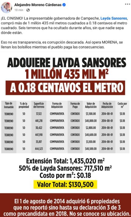 Alito denuncia que Layda Sansores “compró” 143 hectáreas a 18 centavos el metro cuadrado