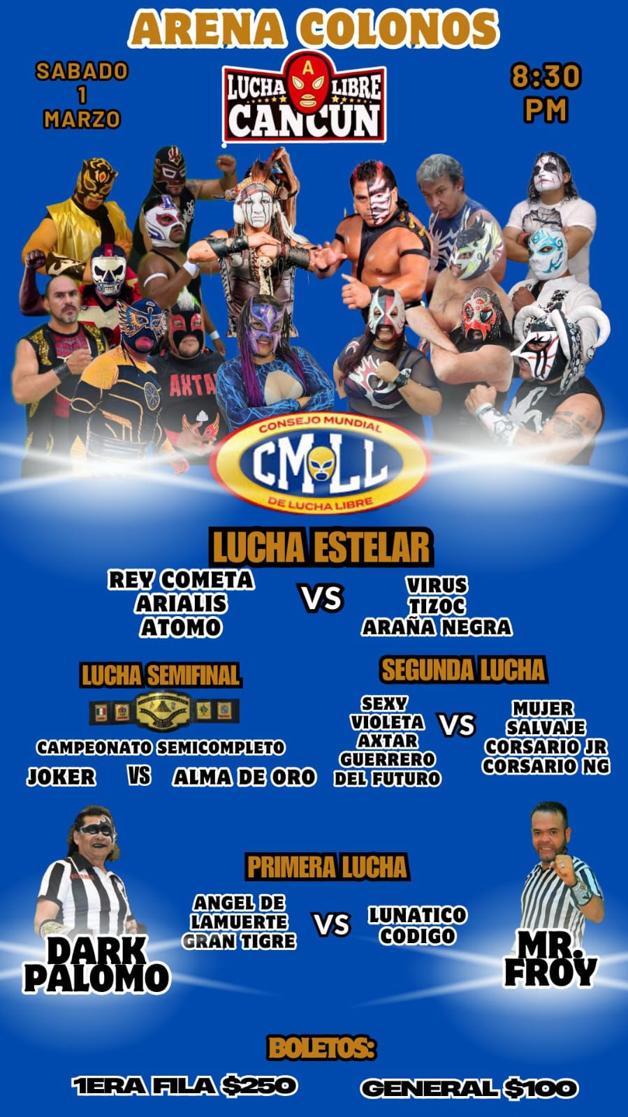 Durante la rueda de prensa, también estuvieron presentes el promotor de LLC, Amador Gutiérrez Guigui; el representante de la Comisión de Boxeo, Lucha Libre y Artes Marciales Mixtas de Benito Juárez, Armando Góngora “Taurus”, además de Axtar, Corsario Jr. y Araña Negra.