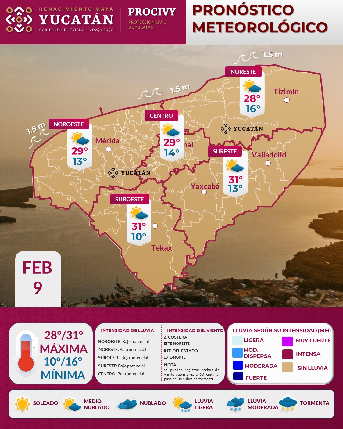 Durante el día dominará un ambiente cálido a caluroso en el interior del estado, con temperaturas máximas que oscilarán entre los 28 y 31 grados Celsius, mientras que en la zona costera se estiman valores más moderados, de 22 a 24 °C.