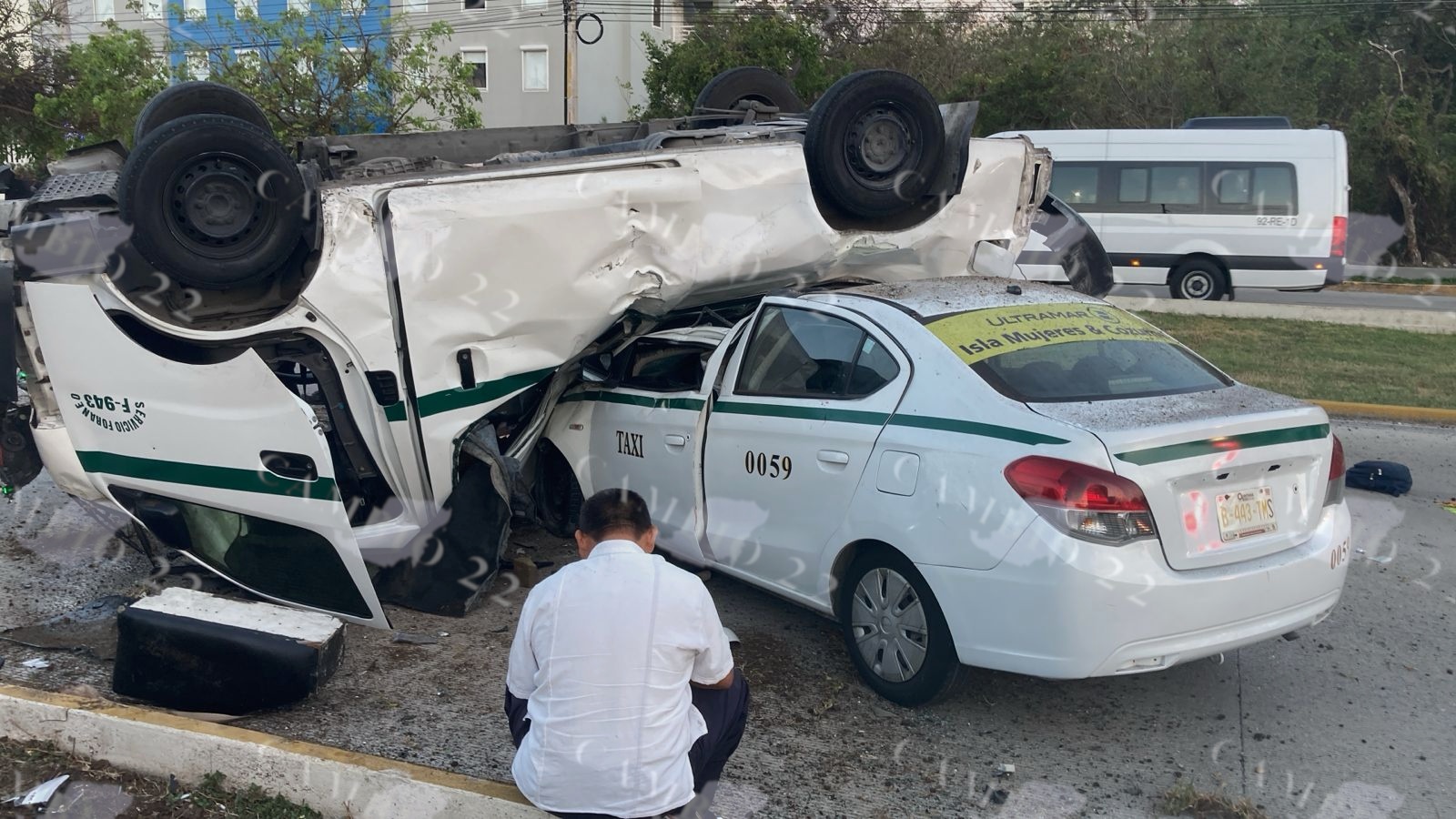 El percance ocurrió frente al Hospital Galenia, a la altura de la supermanzana 11, cuando un Chevrolet gris, al intentar incorporarse a la avenida Tulum en dirección del norte al sur, impactó brutalmente contra una Urvan del sindicato marcada con el número económico 943.