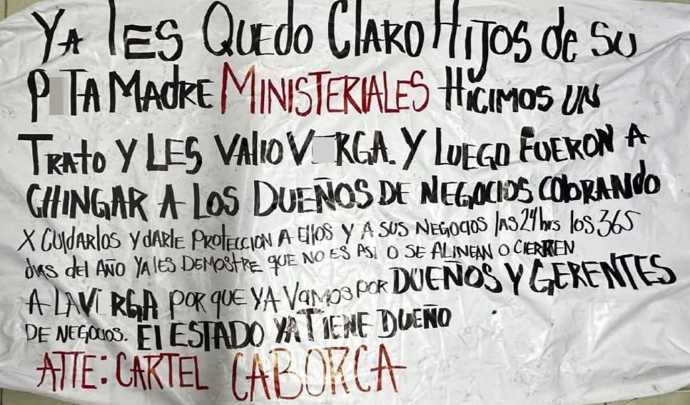 “Ya les quedó claro hijos de su puta madre, ministeriales hicimos un trato y les valió verga y luego fueron a chingar a los dueños de negocios y cobrarles por cuidarlos y darle protección a ellos y a sus negocios las 24 hrs los 365 días del año. Ya les demostré que no es así. O se alinean o cierren a la verga, porque vamos por dueños y gerentes de negocios. El estado ya tiene dueño. Atte: Cártel Caborca” (sic).