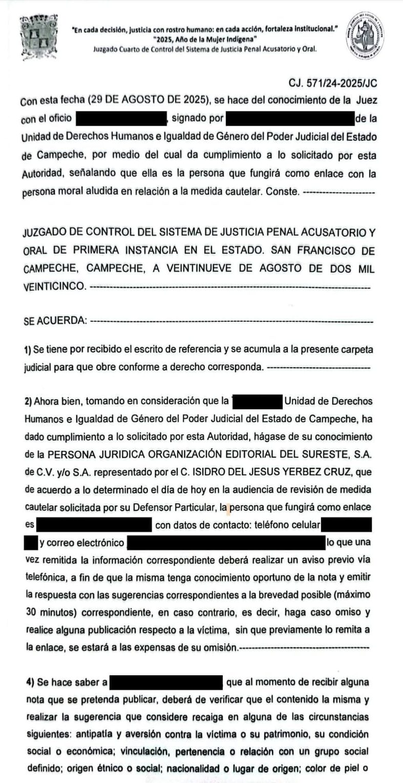 Campeche, Cam., 17 de sepriembre.- El Juzgado de Control del Sistema de Justicia Penal Acusatorio y Oral de Primera Instancia de Campeche, a cargo de la jueza de control Ana Maribel de Atocha Huitz May, resolvió mantener y prolongar por tres meses más las medidas cautelares de censura previa impuestas contra Organización Editorial del Sureste, S.A. de C.V., editora del periódico Tribuna, e incluyó también al periodista Jorge González Valdez.