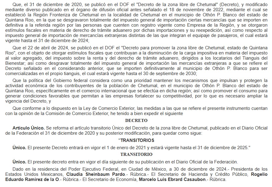 CHETUMAL, 1 de enero.- La presidenta de México, Claudia Sheinbaum Pardo, emitió la ampliación del decreto de la Zona Libre de Chetumal, pero sólo un año más, para que tenga vigencia hasta el 31 de diciembre del 2025.