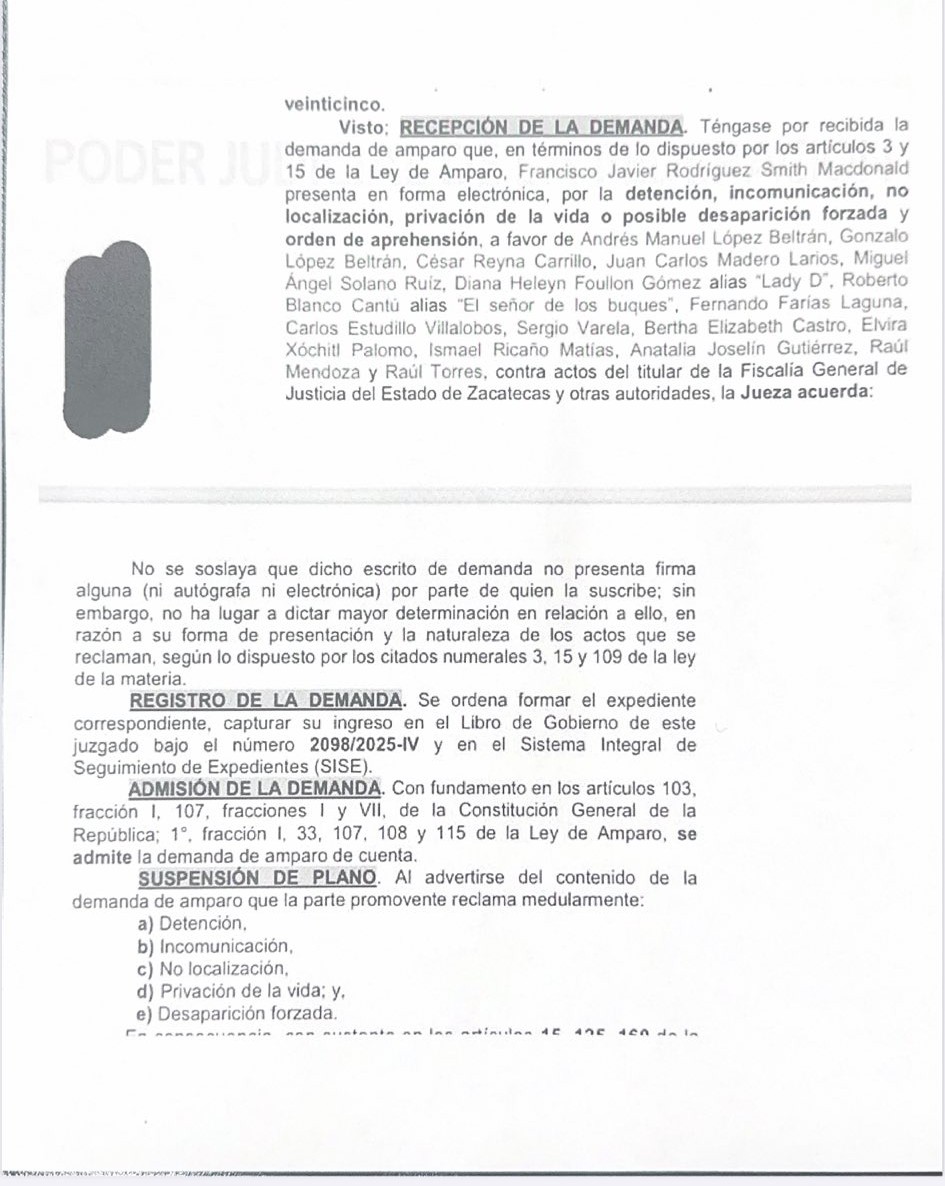 El recurso fue promovido el pasado 16 de septiembre por Francisco Javier Rodríguez Smith Macdonald, presentado de manera electrónica ante el Juzgado Segundo de Distrito en Zacatecas.