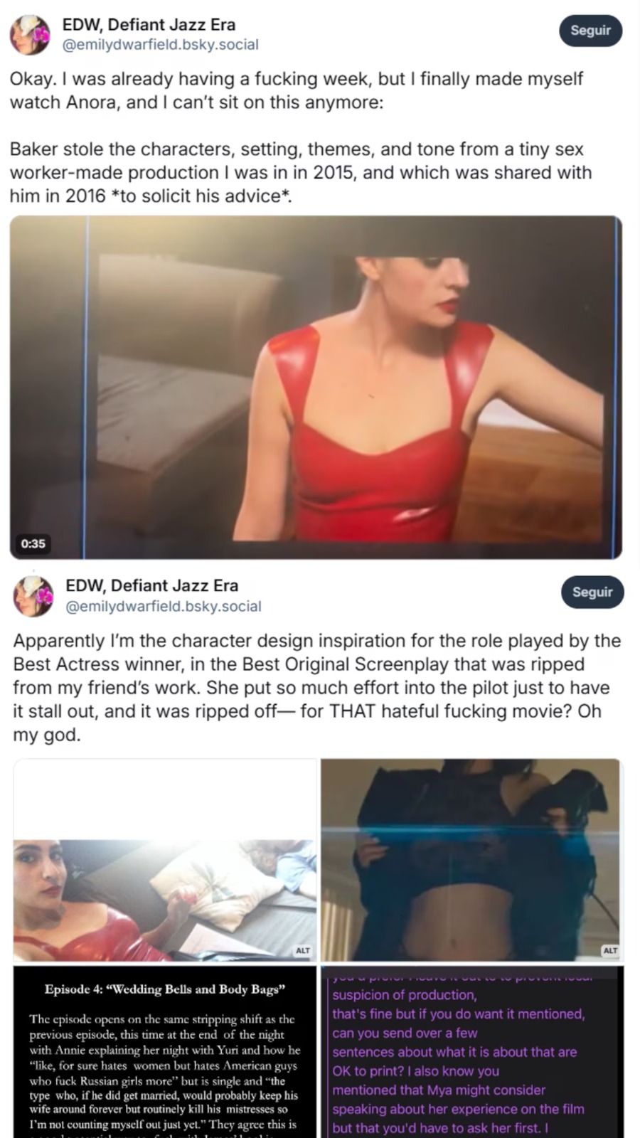 Ahora otra polémica en torno a Anora ha captado las miradas y se trata de una grave acusación de plagio contra Baker, quien también dirigió títulos como El proyecto Florida y Tangerine. A través de una publicación en la plataforma Bluesky, Emily D. Warfield denunció que el director copió su idea. “Finalmente me obligué a ver Anora, y no puedo quedarme sentada con esto”, inició en su post.