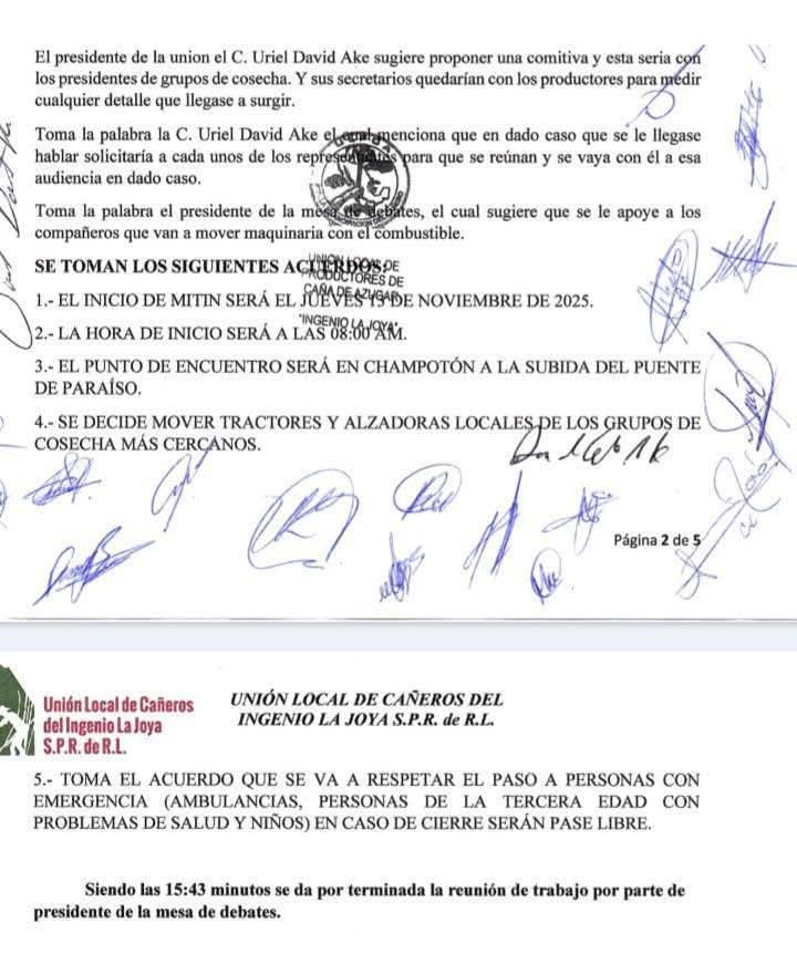 San Francisco de Campeche, Cam., 12 de noviembre.- Integrantes de la Unión de Cañeros del Ingenio “La Joya”, acordaron tomar el puente de Champotón si en las próximas horas no tienen diálogo con las autoridades para recibir subsidio por cada tonelada producida, para lo cual usarán maquinaria y camiones.