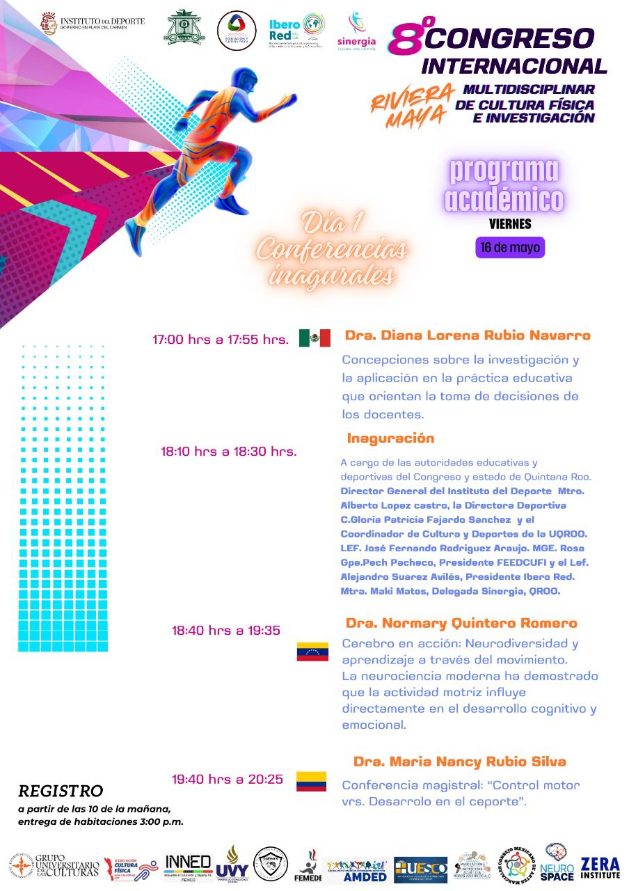 De acuerdo al itinerario de conferencias quedan de la siguiente manera para el día viernes 16 de mayo:  Concepciones sobre la investigación y la aplicación en la práctica educativa que orientan la toma de decisiones de los docentes, a cargo de la Dra. Diana Lorena Rubio Navarro, considerada una de las 10 mejores docentes por el Global Teacher Prize, considerado el Nobel de la Docencia; Cerebro en acción: Neurodiversidad y aprendizaje a través del movimiento. La neurociencia moderna ha demostrado que la actividad motriz influye directamente en el desarrollo cognitivo y emocional, por la Dra. Normary Quintero Romero.