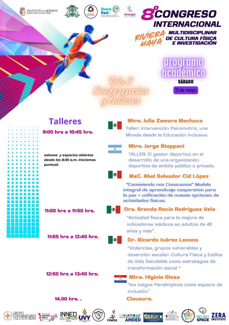 Además la doctora Brenda Rocío Rodríguez Vela, dará el taller de “Actividad física para la mejora de indicadores médicos en adultos de 40 años y más”; “Violencias, grupos vulnerables y deserción escolar: Cultura Física y Estilos de Vida Saludable como estrategias de transformación social”, con el Dr. Ricardo Juárez Lozano; y la destacada Mtra. Higinia Giosa, Miembro del Comité Olímpico Paraguayo desde 1997 y Presidenta del Comité Paralímpico Paraguayo del 2017-2021, entre otros, con “Los Juegos Paralímpicos como espacio de inclusión.”