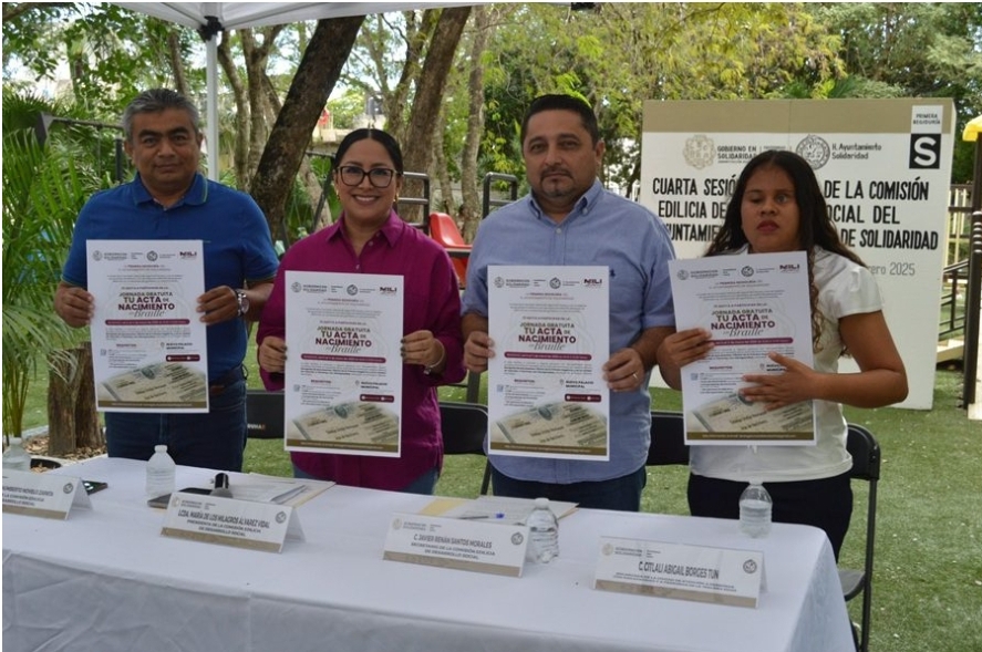 Playa del Carmen, 28 de febrero.- En la cuarta sesión ordinaria realizada en el parque Inclusivo del fraccionamiento Palmas I, la Comisión edilicia de Desarrollo Social del Cabildo de Solidaridad presentó la convocatoria para el trámite gratuito de Actas de Nacimiento en braille, a través de una jornada que se realizará del 10 al 13 de marzo próximo.