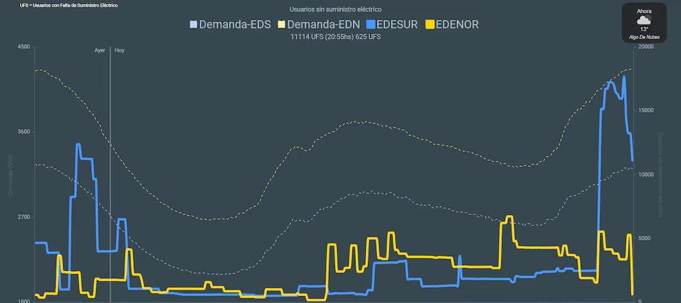 De acuerdo con un gráfico oficial de demanda y usuarios sin servicio, entre las 19:30 y las 20:15 se produjo un salto abrupto en la cantidad de usuarios con falta de suministro eléctrico (UFS), con un máximo que superó los 17.000 usuarios en el área de Edesur. A las 20:55, la cifra descendió a 11.114, mientras Edenor reportaba apenas 625 UFS, una diferencia que deja en evidencia la disparidad entre ambas prestadoras durante el evento.