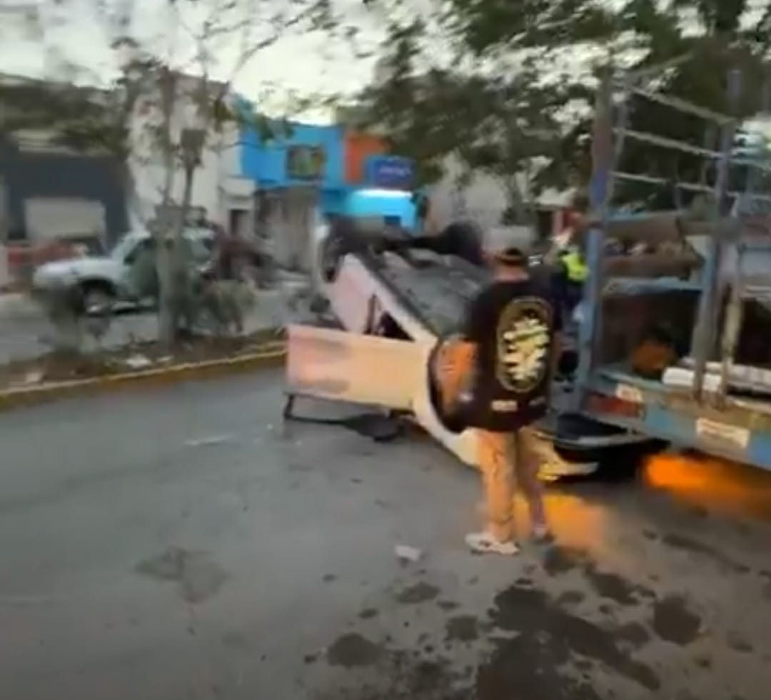 Según testigos vieron que el conductor venía sobre la vía principal y al llegar a una rotonda, por el exceso de velocidad, perdió el control del vehículo y al pegar con el acotamiento del camellón central, este volcó y se arrastró por varios metros hasta terminar incrustado en una camioneta de redilas que se encontraba estacionada, sin que le provocará algún daño.