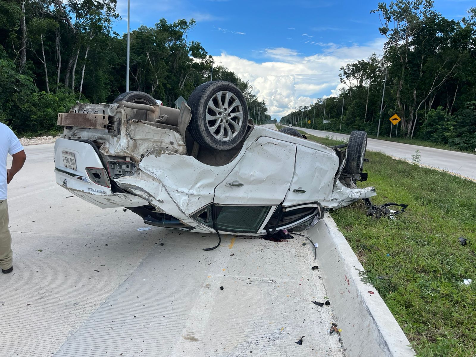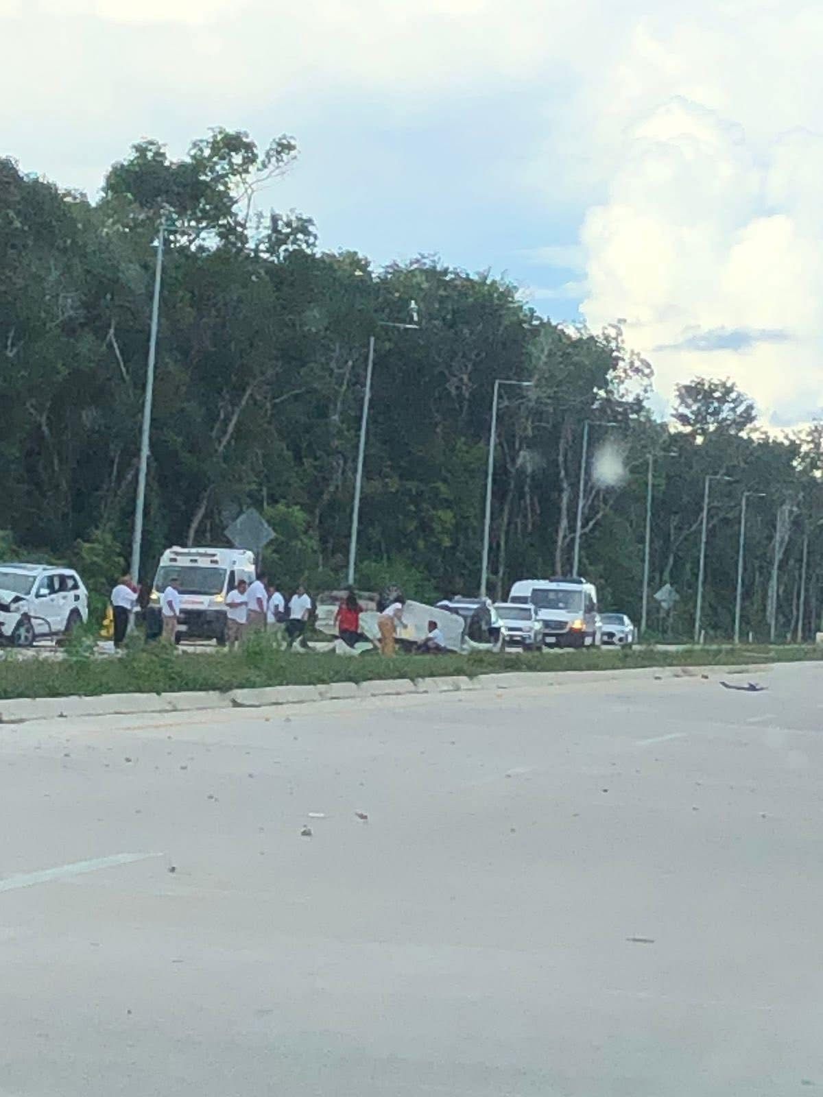 TULUM a 21 de octubre .— Un fuerte accidente vehicular se registró dentro del perímetro del Aeropuerto Internacional de Felipe Carrillo Puerto, luego de que el conductor de un automóvil particular perdiera el control y terminara impactando de frente contra otra unidad.