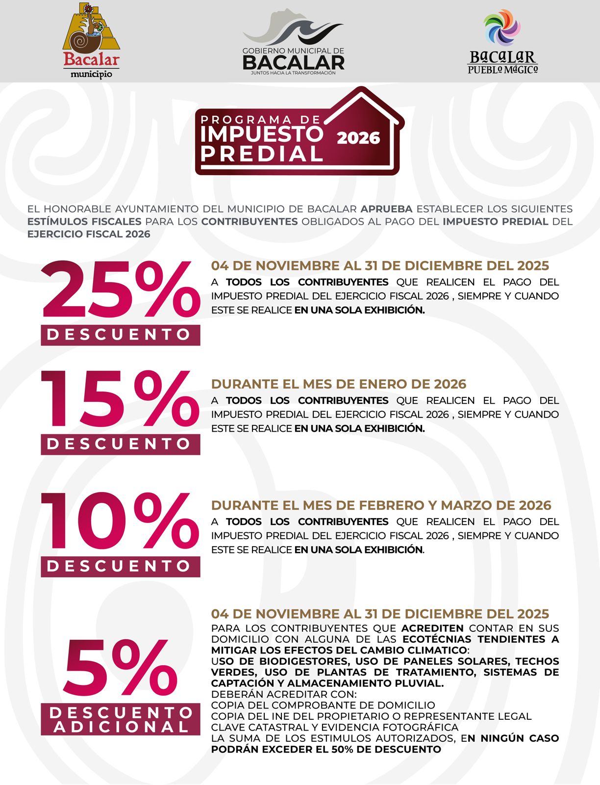 El cabildo también aprobó un 50% de descuento para trabajadores del Ayuntamiento, del sector educativo y concesionarios del sindicato de taxistas de Bacalar, siempre que el predio corresponda a su vivienda habitual y el pago se efectúe entre el 4 de noviembre y el 31 de diciembre de 2025.