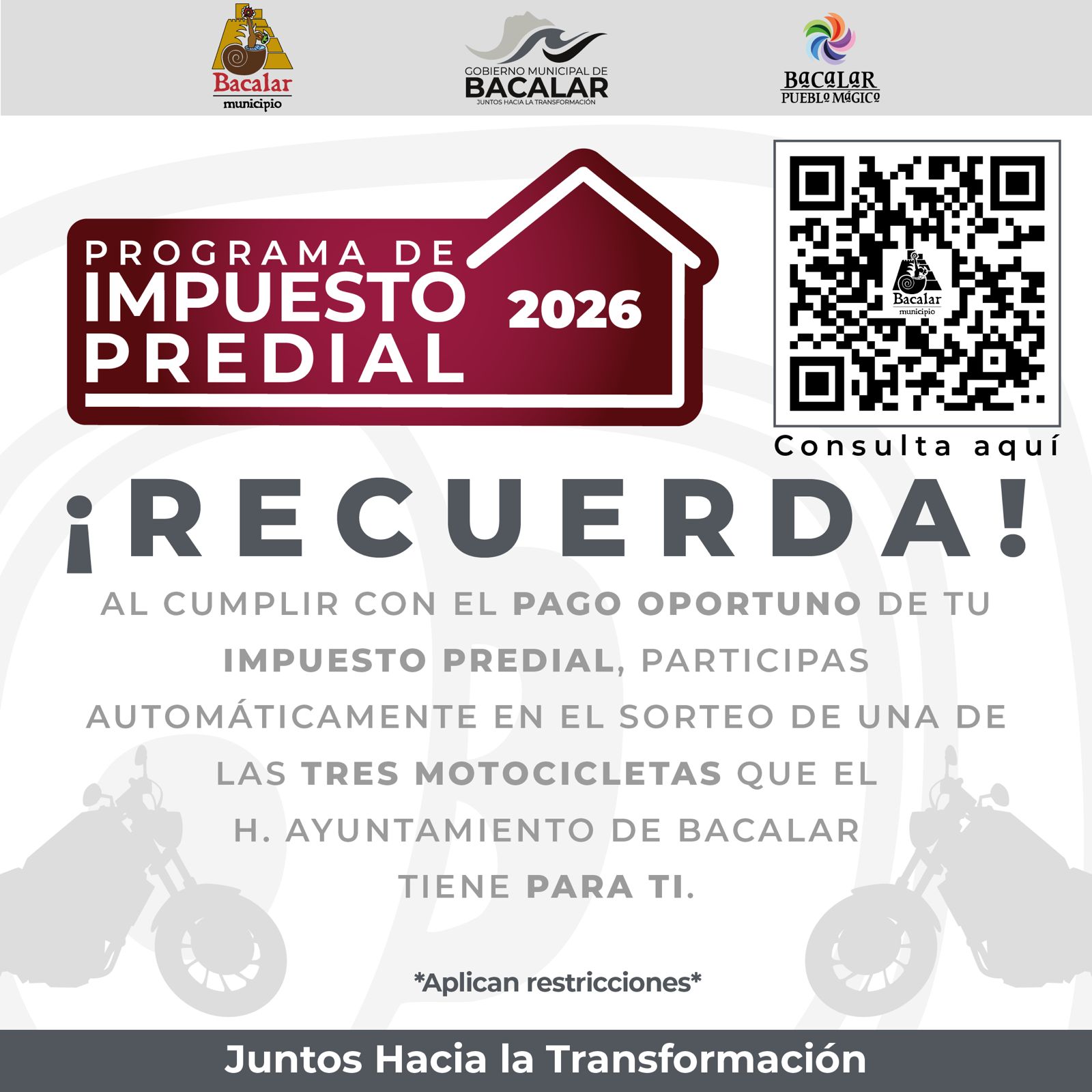 Bacalar, 4 de noviembre.- Con el propósito de fortalecer la recaudación municipal y apoyar la economía familiar, el Ayuntamiento de Bacalar aprobó una serie de estímulos fiscales para el pago anticipado del Impuesto Predial correspondiente al ejercicio fiscal 2026.