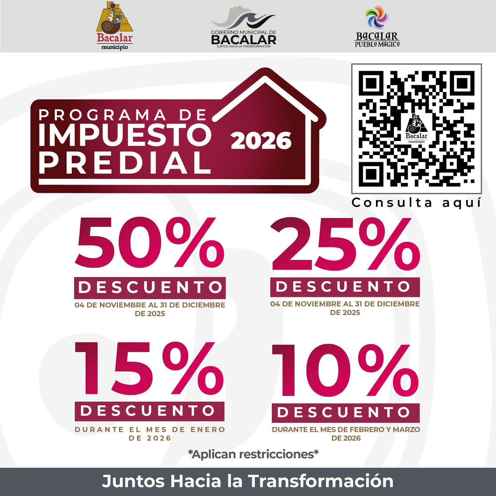 El cabildo también aprobó un 50% de descuento para trabajadores del Ayuntamiento, del sector educativo y concesionarios del sindicato de taxistas de Bacalar, siempre que el predio corresponda a su vivienda habitual y el pago se efectúe entre el 4 de noviembre y el 31 de diciembre de 2025.