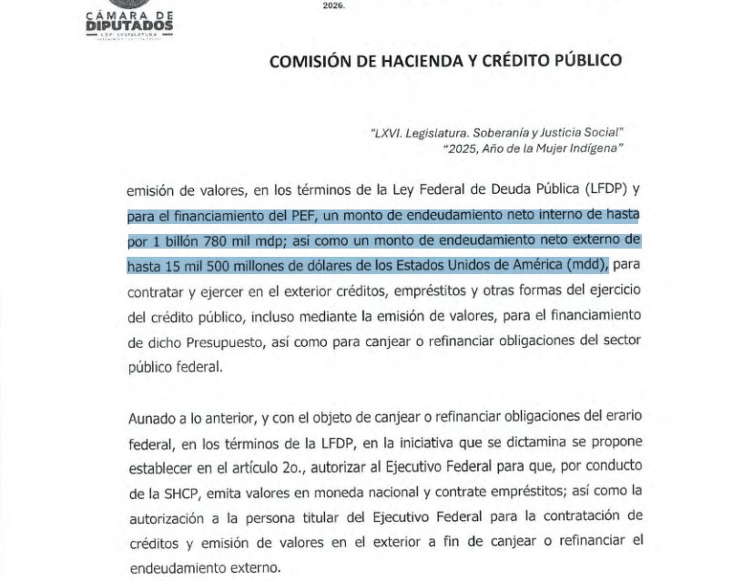Asimismo, se especificó que el gobierno federal podrá utilizar los 15 mil 500 millones de dólares proveniente del endeudamiento internacional para financiar el presupuesto federal del 2026  o para refinanciar deuda externa ya existente.
