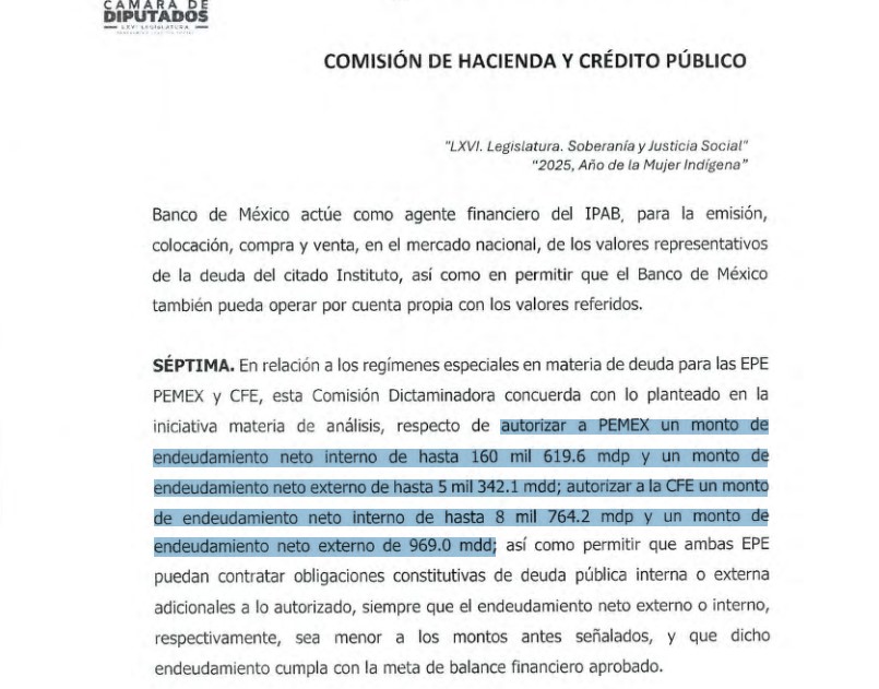 Pero además, la Cámara de Diputados aprobó que Pemex y CFE también pueden contratar deuda interna o externa adicional a los montos señalados, sin que la cantidad de más rebase los mismos.