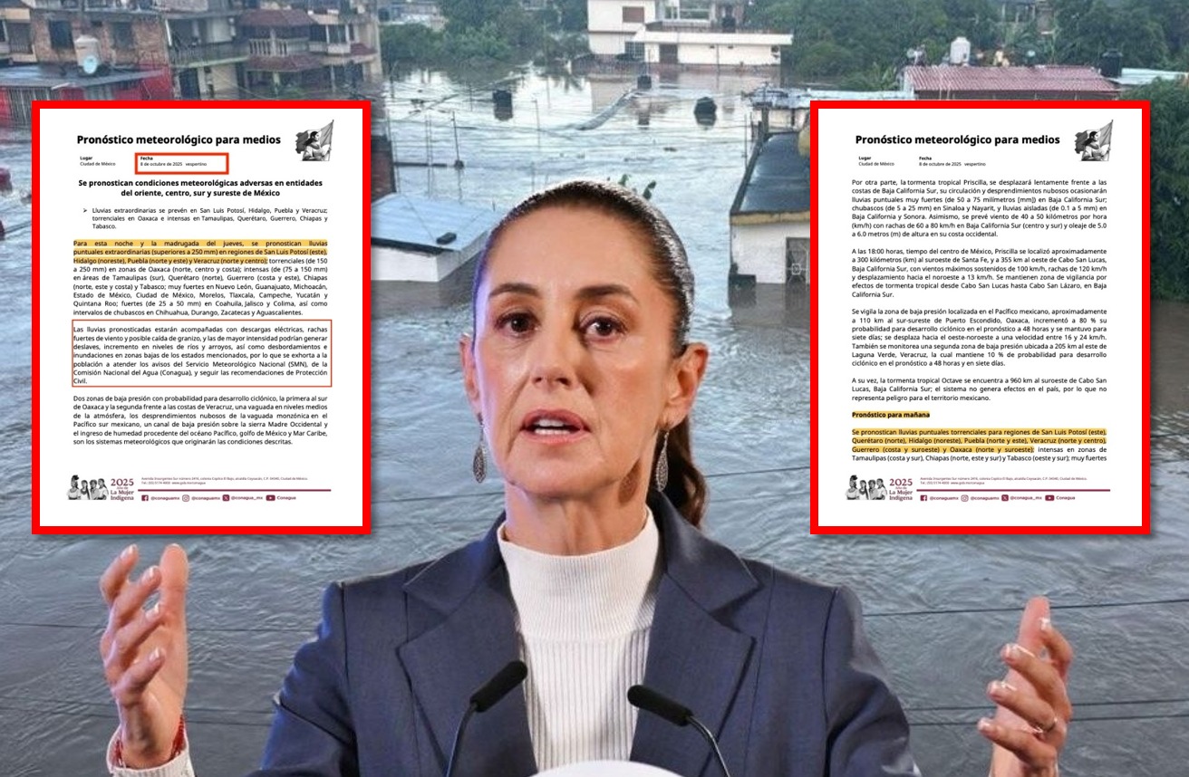 Esta mañana, la presidenta Claudia Sheinbaum aseguró que “no había ninguna condición científica meteorológica que pudiera indicarnos que la lluvia iba a ser de esta magnitud”, sin embargo, desde el 8 de octubre la Conagua advirtió del posible desastre.
