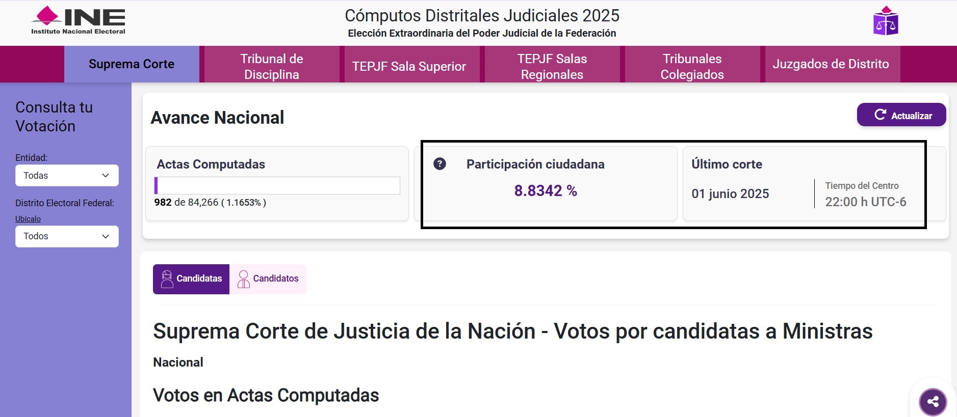 A las 11 de la noche de Quintana Roo, 5 horas después del inicio del cómputo de los votos de la elección de ministros y ministras de la Suprema Corte de Justicia de la Nación (SCJN), el porcentaje de participación verificado en las casillas contadas hasta ese momento es de apenas el 8.8 % de la lista nominal de electores nacional.