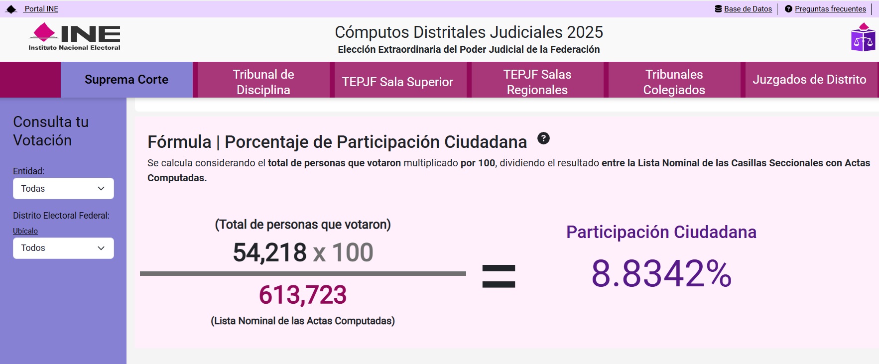 A las 11 de la noche de Quintana Roo, 5 horas después del inicio del cómputo de los votos de la elección de ministros y ministras de la Suprema Corte de Justicia de la Nación (SCJN), el porcentaje de participación verificado en las casillas contadas hasta ese momento es de apenas el 8.8 % de la lista nominal de electores nacional.