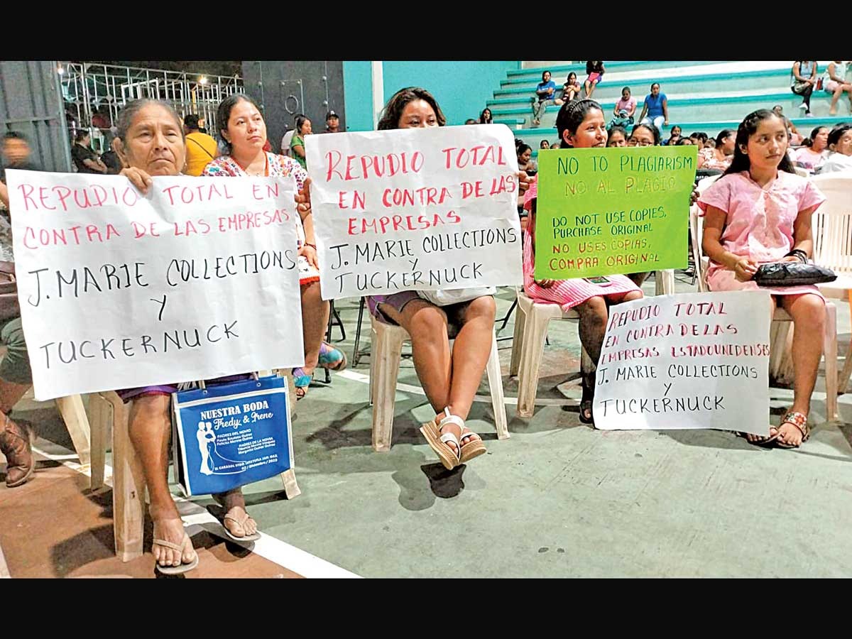 Repudio total en contra de las marcas J. Marie Collections y Tuckernuck”, “¡No al plagio!”, “No uses copias, compra original”, “Nuestra cultura y nuestras tradiciones las compartimos, pero no les pertenece”, expusieron las afectadas en varias cartulinas.