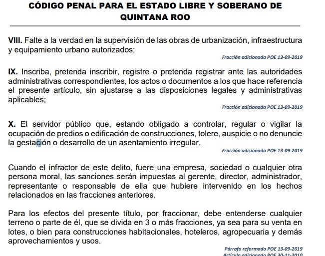 El Decreto 360 que adicionó al Código Penal de Quintana Roo el título “Delitos contra el desarrollo urbano” establece que cometen delito quienes fraccionan sin permisos y quienes expiden licencias para construcciones en lotes ya fraccionados sin autorización.