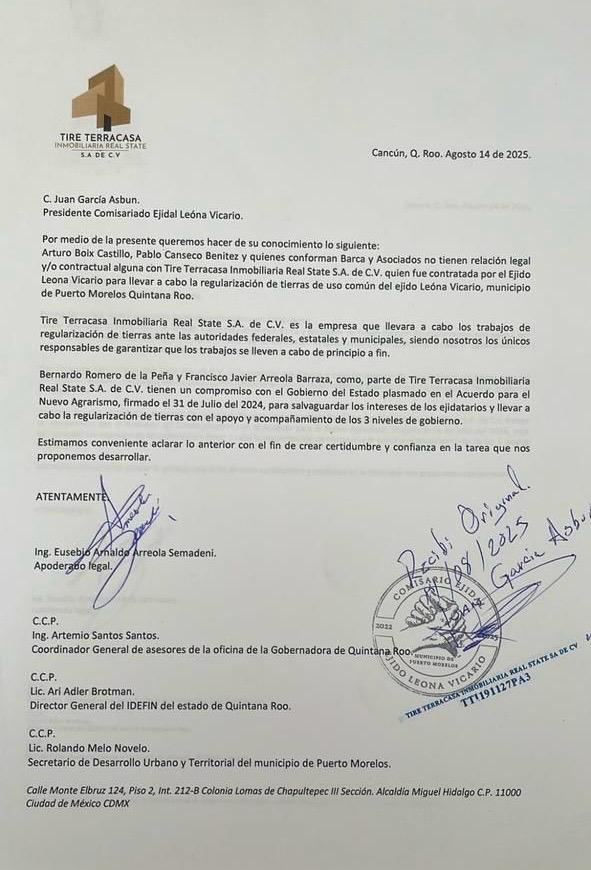 Frente a este escenario, la empresa Terracasa Inmobiliaria Real State S.A. de C.V., contratada por el ejido Leona Vicario para regularizar las 250 hectáreas de uso común, dirigió el 14 de agosto de 2025 una carta al presidente del comisariado ejidal, Juan García Asbun, en la que aclara que Arturo Boix Castillo, Pablo Canseco Benítez y quienes conforman Barca & Asociados no tienen relación legal ni contractual alguna con “Terracasa”.