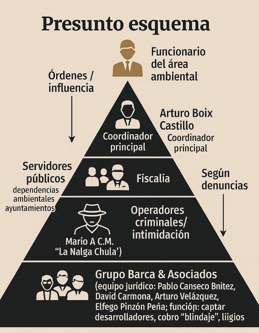 Paralelamente, Boix contaba con operadores de choque provenientes del crimen organizado, un personaje clave fue Mario A. C. M., alias “La Nalga Chula”, un conocido operador de trabajos sucios que fungió como intimidador principal hasta su encarcelamiento este 2025, tras la detención de “Nalga Chula”, el señor Elfego Pinzón un pseudo “ingeniero topógrafo” con supuestos vínculos delictivos asumió el papel de brazo ejecutor de las amenazas.