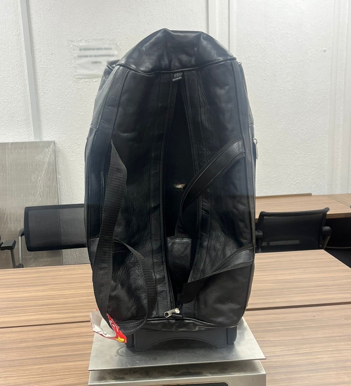 La revisión física y detallada del equipaje permitió a los agentes localizar un doble fondo que contenía un paquete con polvo blanco.
