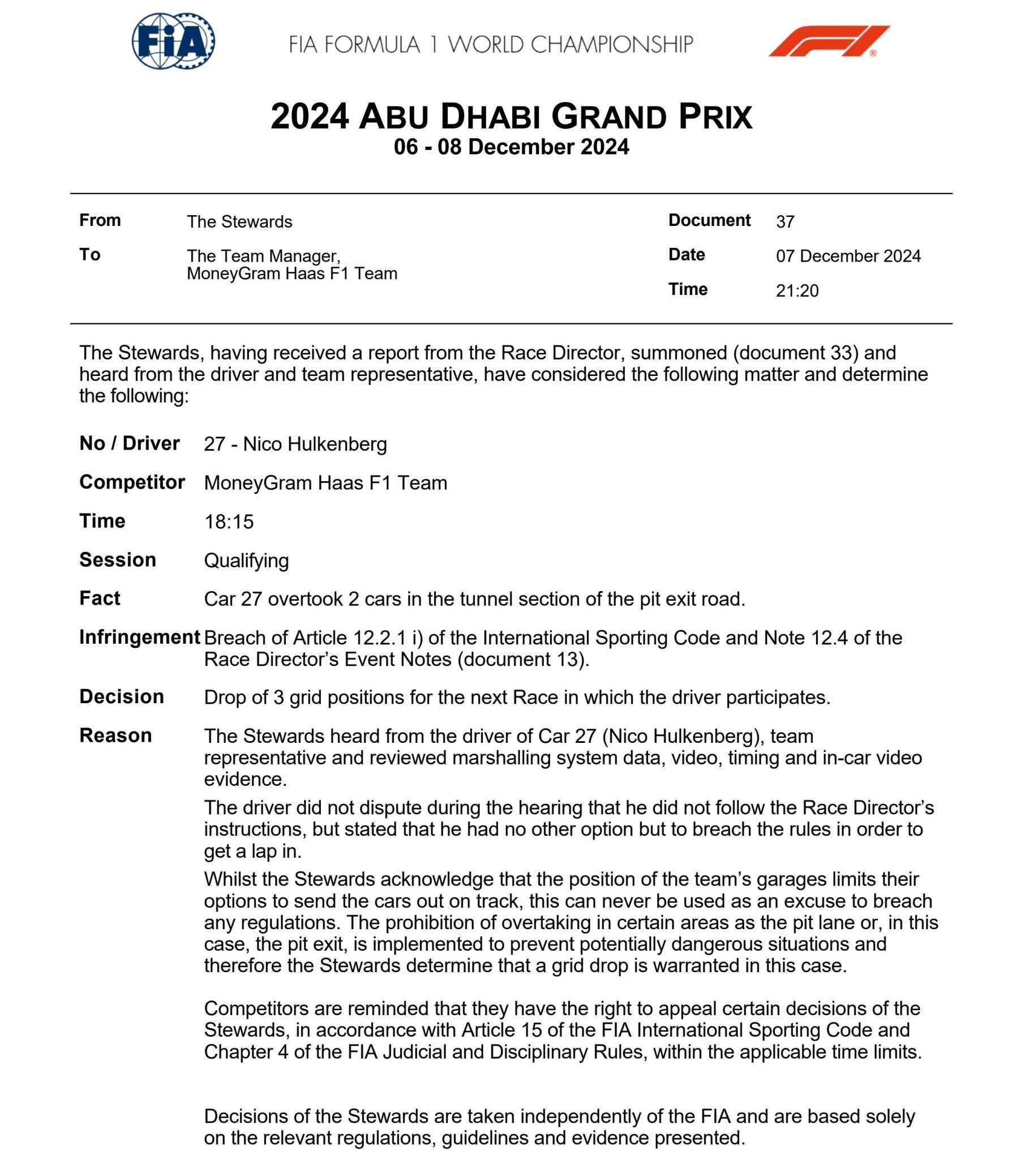 Nico Hulkenberg recibió una penalización de tres puestos en la parrilla de salida por adelantar dos autos en la sección del túnel de pista en la salida de boxes durante la Clasificación del GP de Abu Dhabi. En la Clasificación terminó cuarto.