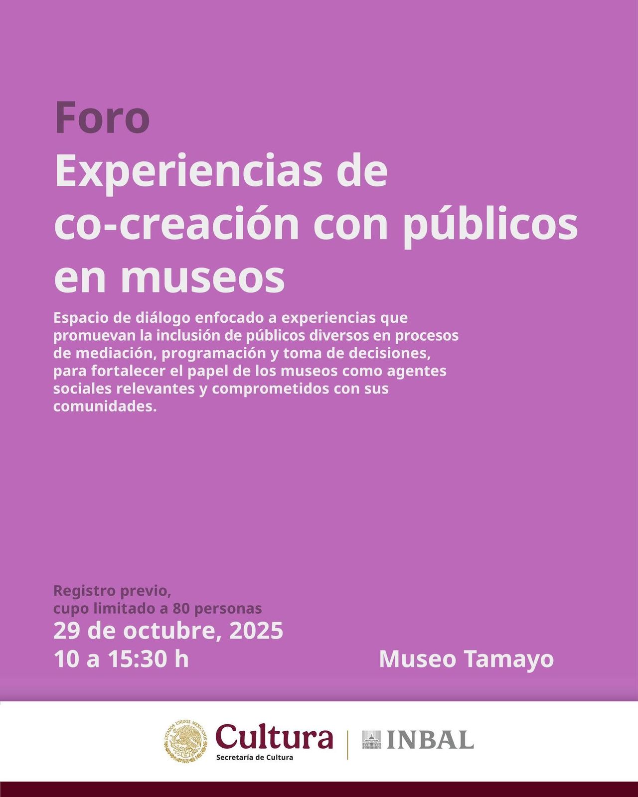 El Instituto Nacional de Bellas Artes y Literatura (INBAL), a través de la Coordinación Nacional de Artes Visuales (CNAV), reunirá a profesionales de museos, mediadores culturales, investigadores y gestores de su Red de Museos, así como del Centro Cultural Universitario Tlatelolco (CCUT) y del Museo Universitario de Arte Contemporáneo (MUAC), ambos de la Universidad Nacional Autónoma de México (UNAM), además de representantes del Museo de Arte Contemporáneo de Monterrey (MARCO) y del Museo de Arte Contemporáneo de Ecatepec (MarCe), en el foro Experiencias de Co-Creación con Públicos en Museos.
