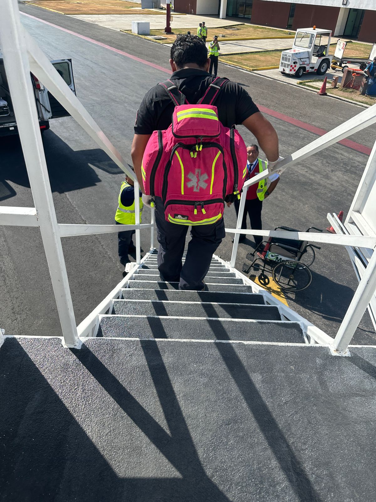 Antes del arribo de la aeronave, los paramédicos ya se encontraban en la pista a la espera del paciente, luego de que la tripulación notificara sobre la situación médica a bordo. Gracias a la coordinación con autoridades aeroportuarias, se facilitó el descenso del pasajero para su atención sin contratiempos. Al momento de bajar del avión, el paciente fue estabilizado por los paramédicos, quienes de inmediato aplicaron las maniobras necesarias para controlar los síntomas que presentaba.