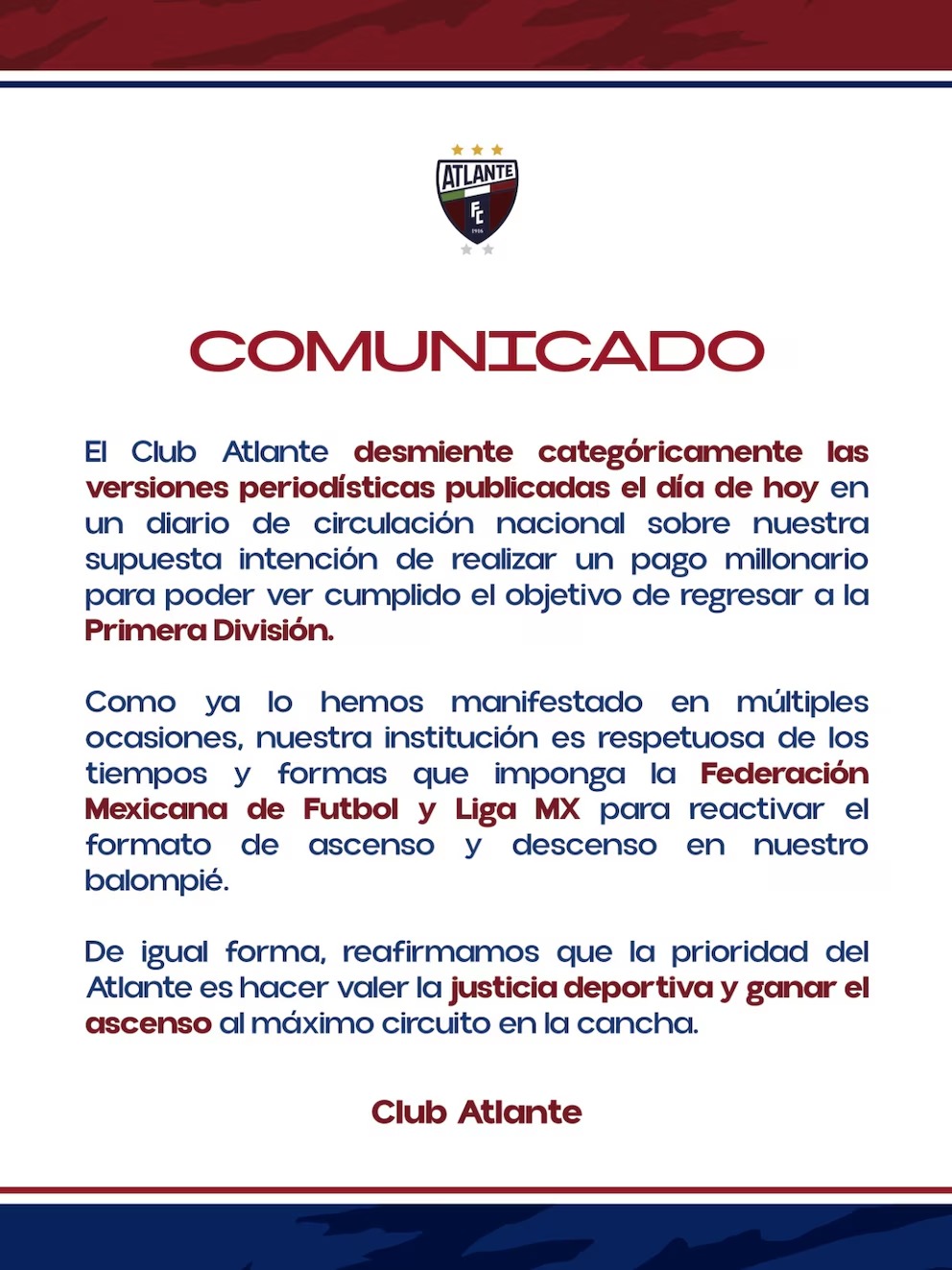 El Club Atlante desmiente categóricamente las versiones periodísticas publicadas el día de hoy en un diario de circulación nacional sobre nuestra supuesta intención de realizar un pago millonario para poder ver cumplido el objetivo de regresar a Primera División.