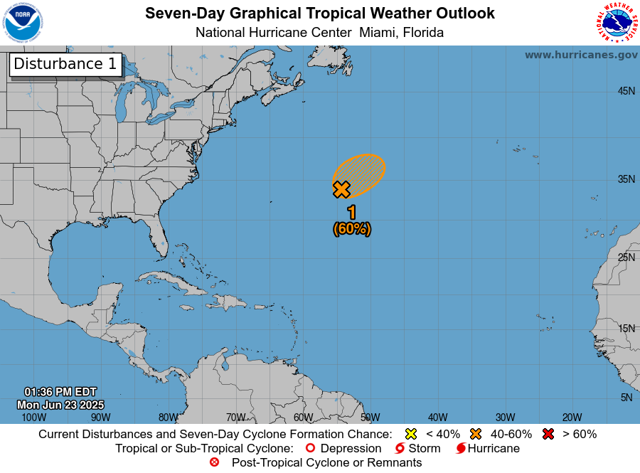 El CNH considera que las condiciones ambientales en el centro del Atlántico subtropical aún son marginalmente favorables para un mayor desarrollo, por lo que un aumento en la actividad de tormentas eléctricas podría resultar en la formación de una depresión tropical o tormenta tropical de corta duración hoy o esta noche.