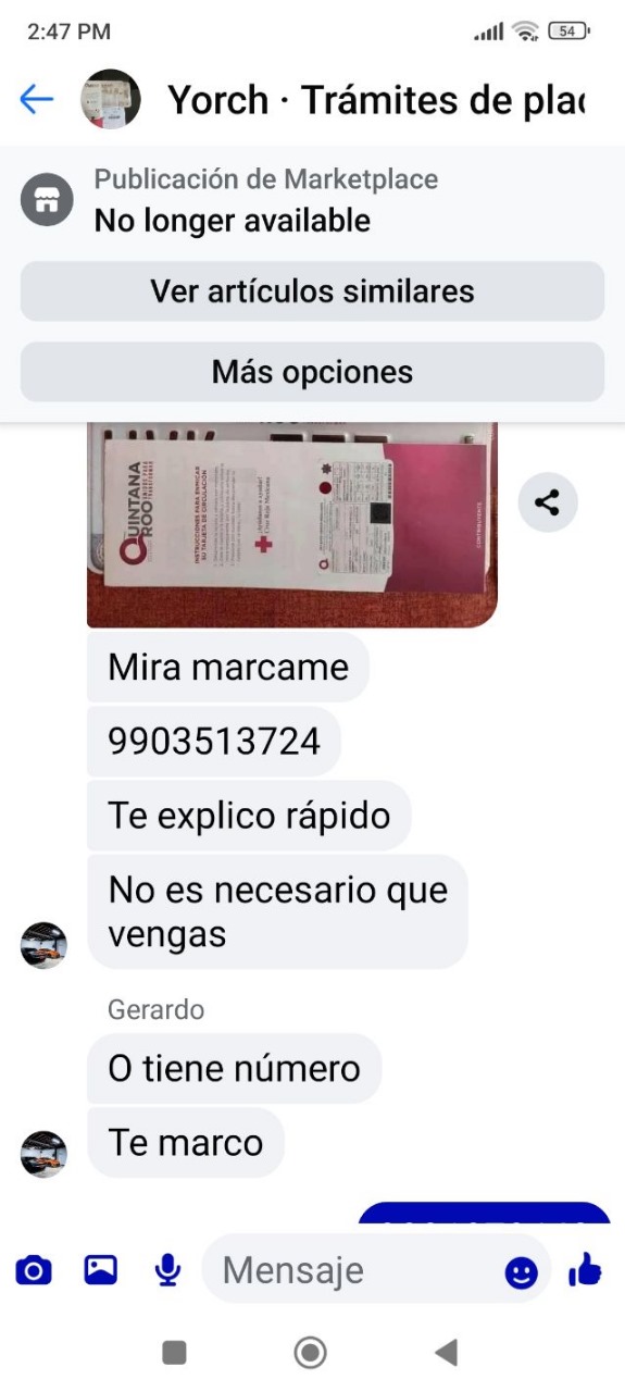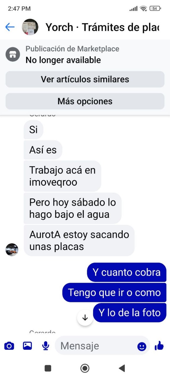 En varios de los perfiles señalados, como uno registrado bajo el nombre “Yorch – Trámites de placas y licencias”, se observan publicaciones recientes que ofertan licencias a precios que van de mil 500 pesos en adelante, acompañadas de imágenes de documentos oficiales del Gobierno de Quintana Roo. En los mensajes privados, uno de los presuntos gestores confirma trabajar “acá en Imoveqroo” y ofrece completar los trámites sin la presencia física del interesado, únicamente con fotografías y datos básicos.