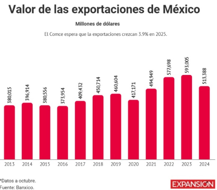 El Consejo Empresarial Mexicano de Comercio Exterior, Inversión y Tecnología (Comce) estima que para este año las exportaciones de México crecerán un 3.9%, y para 2026 se proyecta un crecimiento del 4.4%.