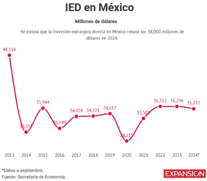 En cuanto a la inversión extranjera directa (IED), el Comce anticipa que alcanzará los 39,324 millones de dólares en 2025, un ligero incremento respecto a los 38,411 millones proyectados para 2024. Sin embargo, los empresarios del comercio exterior ven potencial para que la IED llegue a 48,000 millones de dólares en los próximos dos años.