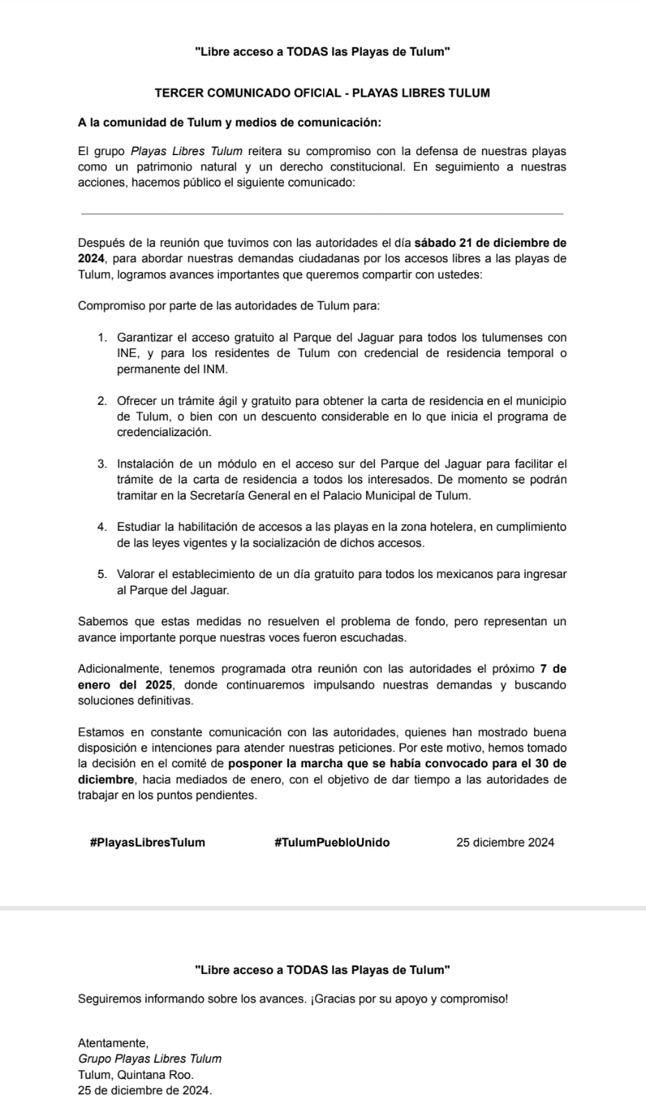 En un comunicado, el colectivo anunció que la protesta programada para el 30 de diciembre quedó suspendida, con el objetivo de dar tiempo a las autoridades para trabajar en los compromisos asumidos. Aunque estos acuerdos no resuelven completamente el problema, los representantes del grupo los calificaron como un avance importante en su lucha por el libre acceso a las playas públicas de Tulum.