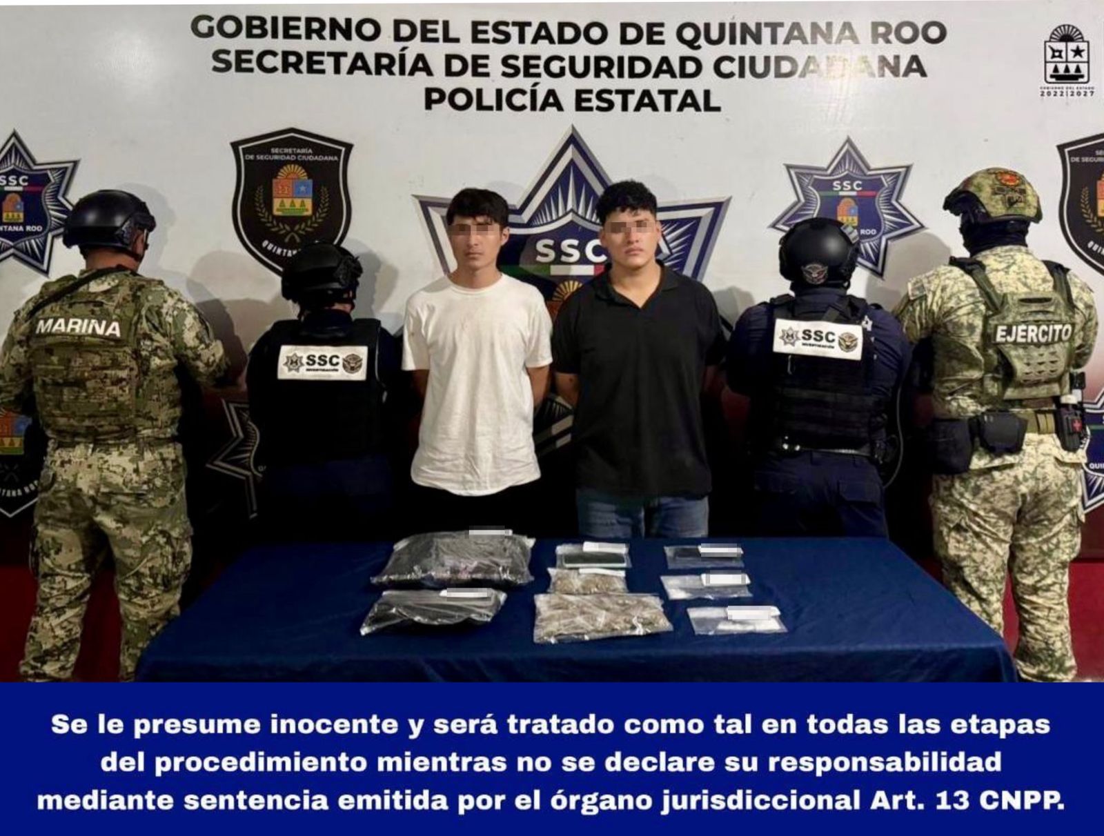 La primera intervención ocurrió en el fraccionamiento Villas Otoch Paraíso, específicamente sobre la Avenida Niños Héroes, en donde las autoridades detectaron a dos hombres identificados como Carlos Eduardo N y Ronald N, quienes se encontraban junto a una motocicleta intercambiando bolsitas con presunta droga.