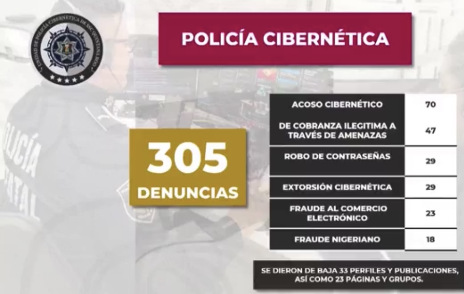 “Hay alrededor de entre 80 y 100 denuncias que se atienden por semana por diversos delitos, hablamos desde el fraude nigeriano, fraude en sus diversas modalidades, acoso cibernético y otros más y se trabaja con la Fiscalía General del Estado para la atención de todas y a partir de ahí, se han logrado detenciones y si ha habido incluso cateos a los call centers por estos delitos de índole cibernético y se está trabajando de la mano con la Fiscalía para disminuir estos delitos.”