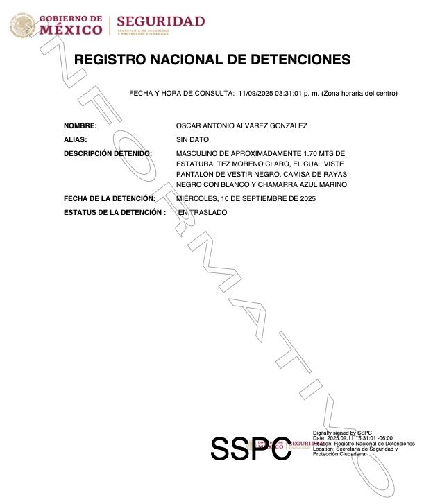 De acuerdo con la ficha del Registro Nacional de Detenciones, se le describe como un “masculino de aproximadamente 1.70 de estatura, tez morena clara. Al momento de la detención vestía pantalón de vestir negro, camisa de rayas negro con blanco y chamarra azul marino”.