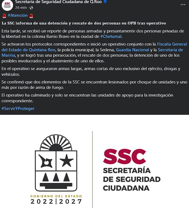 Chetumal, 1 de junio.- La Secretaría de Seguridad Ciudadana (SSC) de Quintana Roo confirmó este domingo la detención de una persona, así como el rescate de dos víctimas presuntamente privadas de su libertad, como resultado de un operativo de seguridad implementado en la colonia Barrio Bravo, en la ciudad de Chetumal. El despliegue se llevó a cabo en coordinación con la Fiscalía General del Estado, la Sedena, la Guardia Nacional, la Secretaría de Marina y la Policía Municipal.
