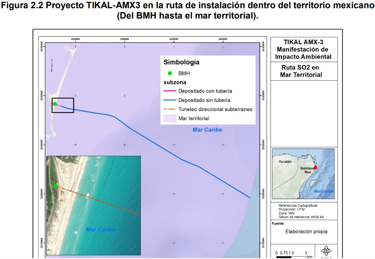 La empresa solicitó permiso para interconectar territorio mexicano, con un tendido de cable que abarcará una ruta de 22.3 kilómetros desde un pozo de amarre ubicado en el camellón central del Boulevard Kukulcán de Cancún, a la altura de Playa Delfines, hasta el límite del mar territorial.