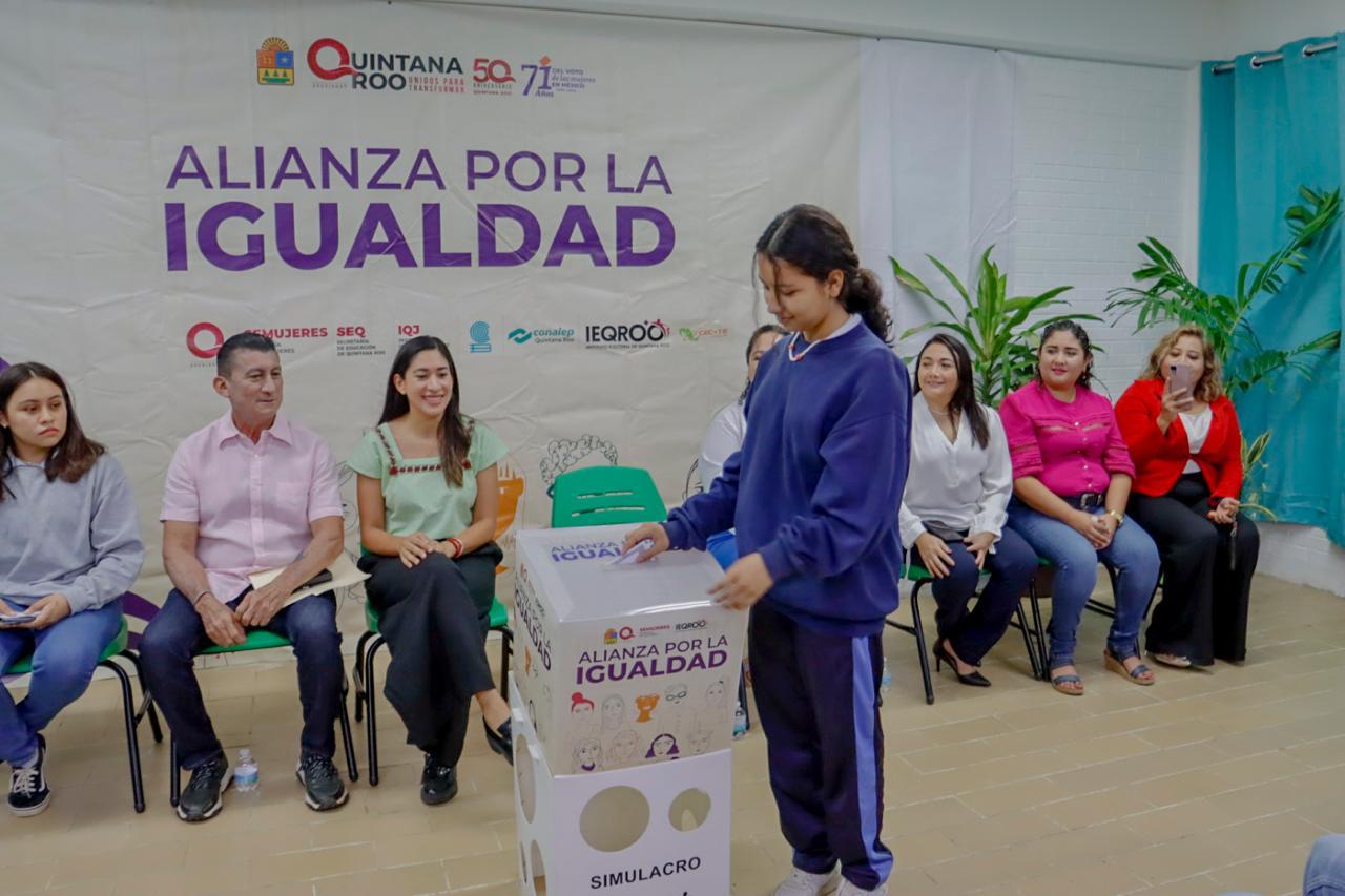 Bacalar.- La Secretaría de las Mujeres (SEMUJERES) que encabeza Esther Burgos Jiménez, en coordinación con el Instituto Electoral de Quintana Roo (IEQROO), llevaron a cabo el ejercicio de participación democrática dirigido a mujeres jóvenes y adolescentes estudiantes del Colegio de Bachilleres Plantel “Serapio Flota Mass” del municipio de Bacalar.