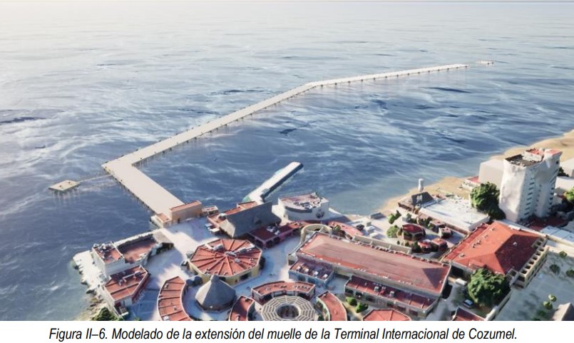 En cuanto a la extensión del Muelle Internacional de Cruceros de Cozumel, actualmente en evaluación de la Semarnat, el proyecto consiste en un conjunto de obras de infraestructura portuaria destinadas a optimizar la capacidad operativa de la terminal marítima.